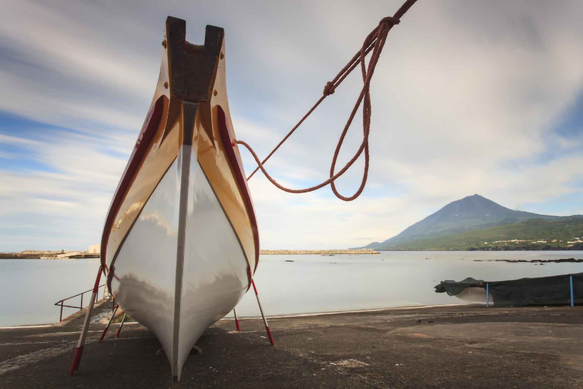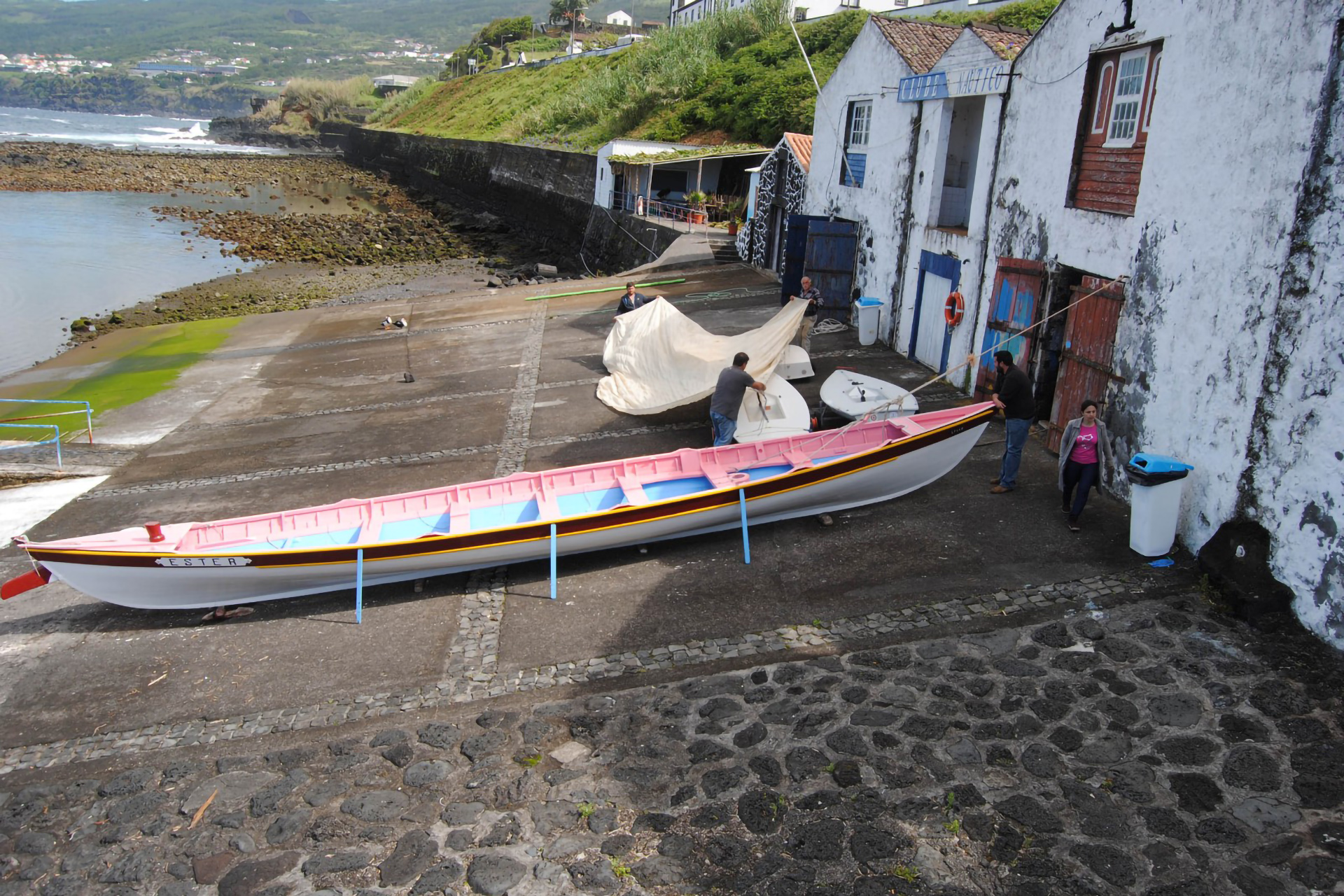 The two story buildings were built in traditional stone masonry, plastered and whitewashed. On the ground floor there are large gates, through which the whaleboats leave, as well as the respective access ramp to the sea.