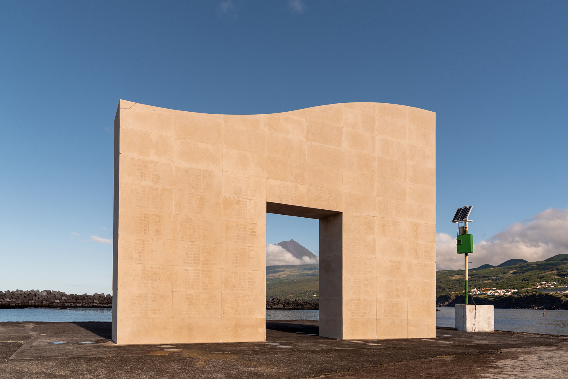 The monument, erected precisely where, until the 1950s, the sperm whales were dismantled, is a kind of gigantic doorway, covered in marble, reminiscent of a moving wave, with a gap at the base connecting the earth and the sea, man and animal.
